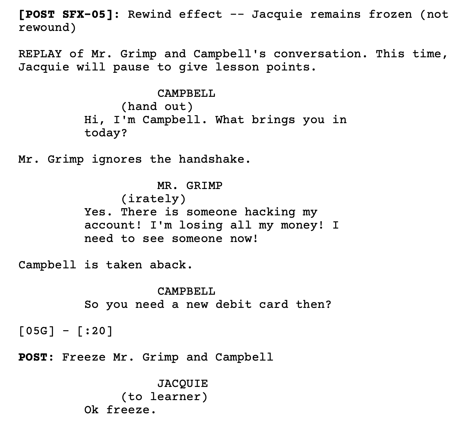 Retail Banking: Fraud illustrates the live action approach. A distressed customer storms into a branch, and the learner must follow procedure to de-escalate the situation and coordinate with the fraud department in real time. The filmed environment puts the learner inside a genuinely tense interaction — emotional realism that only live action can deliver.